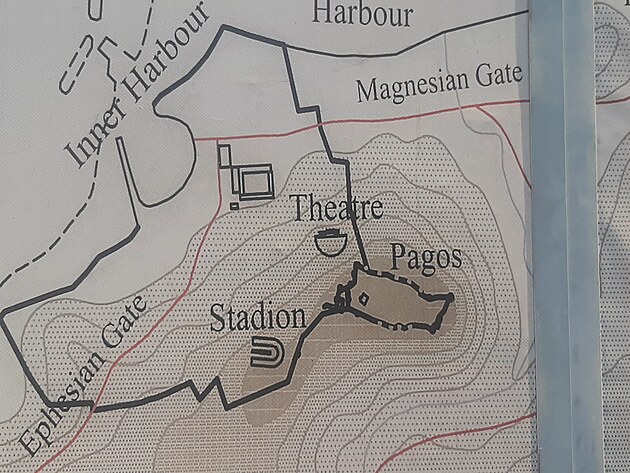 Antický stadion ve Smyrně je ale podle mapy docela pěšky daleko od agory a baziliky podobně jako antické divadlo, což ukazuje, jak velké to muselo být město v raně křesťanské době. Ke stadionu ani k ruině antického divadla jsme dojít nestihli, protože veřejná doprava v Izmiru je pro Evropana dost náročná a podle internetu je antický Stadion stejně obestavený a asi i zastavěný moderními domy ( viz foto nákresu mapy z infotabule).