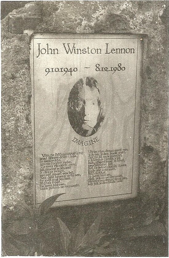 Včera si svět připoměl čtyřicáté výročí tragické smrti Johna Lennona, což zaznamenala i většina našich médií, včetně České televize. Komentáře si často všímají fenoménu tzv. Lennonové zdi v Praze, kde se již od jeho smrti scházeli jeho příznivci. O Lennonově zdi na Kampě slyšel asi každý, ovšem málokdo ví, že kousek pod vrcholem beskydské hory - Smrk vznikl po Lennonově smrti pomníček, který připomínal pocestným, textem písně Imagine, Lennonovo životní poselství. Fotky jsou asi z roku 1984.