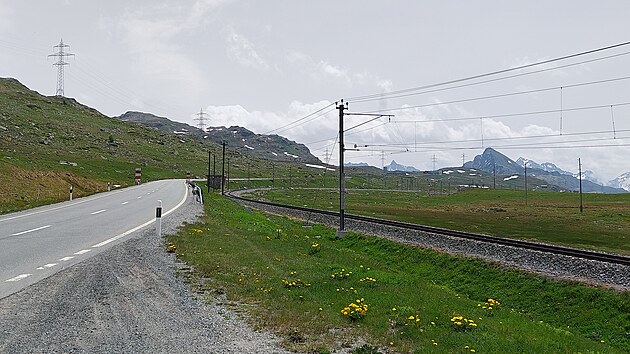 Trať Bernina Expresu se mi před vrcholem průsmyku celkem podle očekávání ztratila z dohledu, ale na druhé straně od něj se zase včas vynoří. Což přesně potřebuji.