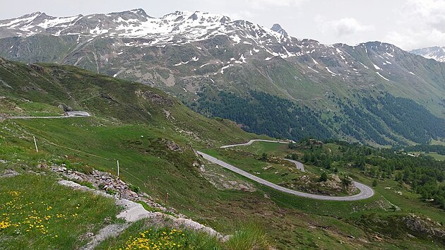 Za Svatým Mořicem mě čeká ještě průsmyk Bernina (německy Berninapass, italsky Passo del Bernina). Pozoruhodné je, že tudy dokázali prohnat železnici, jejíž nejvyšší bod je o 95 metrů níže než vrchol průsmyku. Po této trati jezdí Bernina Expres, a když už se tedy ve svém názvu honosí tím druhým slovem, pak je to jeden z nejpomalejších rychlíků na světě.