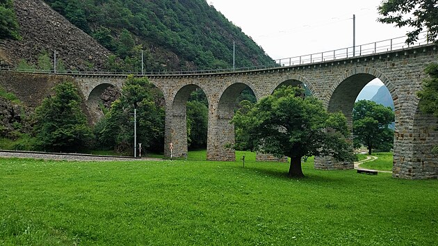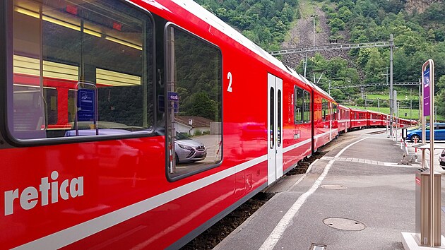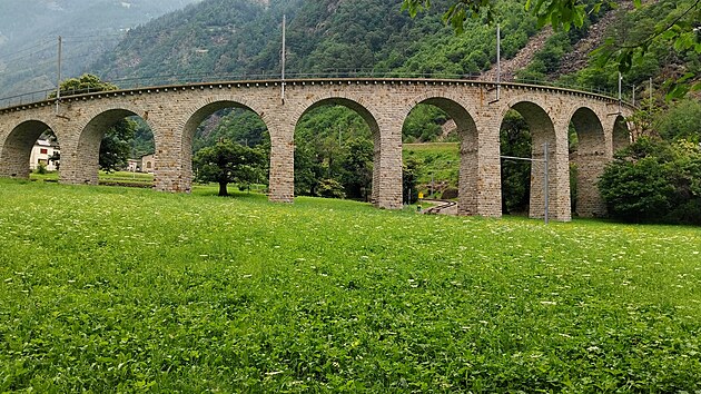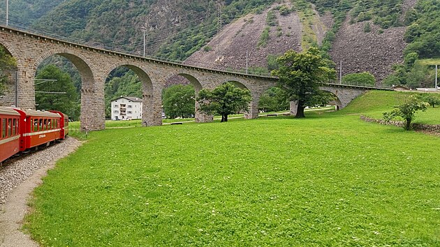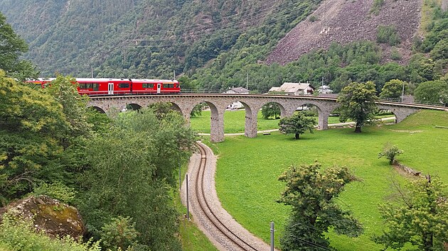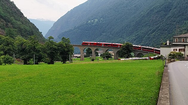 Jasně červený vlak nese na bocích nejen nápis Bernina Expres, ale též název železniční společnosti vyvedený ve všech čtyřech švýcarských jazycích: německy Rhätische Bahn, rétorománsky Viafier retica, italsky Ferrovia retica a francouzsky Chemins de fer rhétiques. Celkem Bernina Expresem ujedu jen asi 1700 metrů. Za tři franky se ale svezu po jednom z nejznámějších železničních viaduktů, který je symbolem zdejší železniční dopravy.