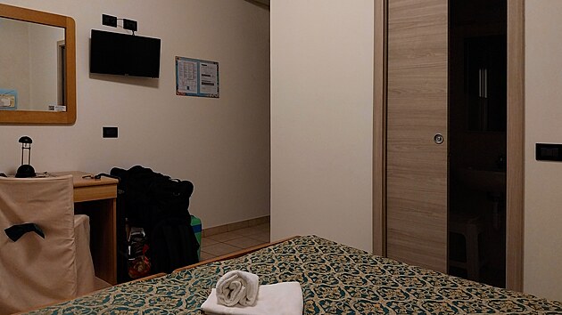Pokoj je malý, ale za cenu 50 eur na noc přímo luxusní, jen postel mě trochu zlobí. Při jakémkoliv pohybu totiž vydává přímo šílené zvuky. Tak jen doufám, že nebudu v noci sám sebe budit.