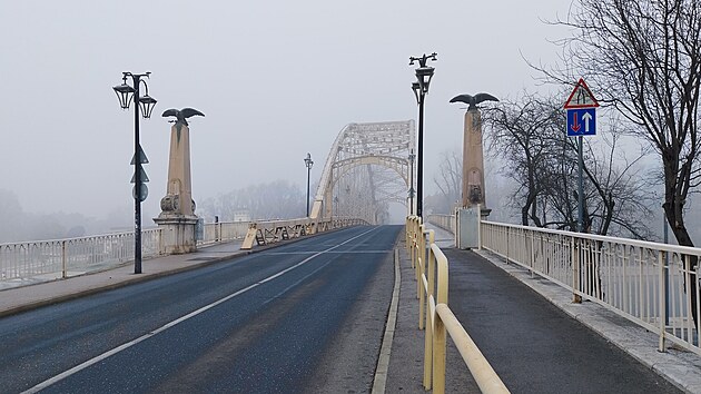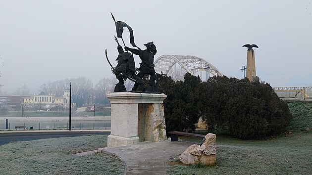 V mlze je sotva patrný Kossuthův most (maďarsky Kossuth híd) z roku 1928, spojující historické centrum s okrajovými čtvrtěmi. Stihl jej stejný osud jako mosty budapešťské – v roce 1945 ho zničili ustupující Němci. Spolu s mostem byl zničen i jeden ze čtyř pilířů se sochami turulů, podle dobových fotografií to byl ten z našeho pohledu vlevo. Obnova mostu byla dokončena v roce 1950.