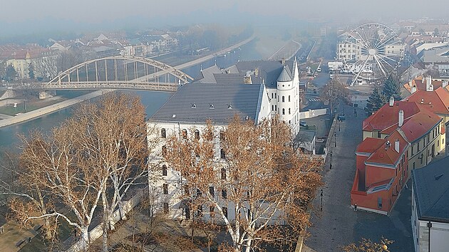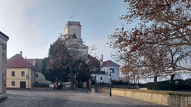 Od mostu se dá pohodlně vyjít na kopec Káptalandomb, jediné vyvýšené místo v Győru a zároveň historické jádro s nejvýznamnějšími památkami. Než ujdu ty dvě stovky metrů, začne se konečně ztrácet mlha, a tak najednou vidím věž Biskupského hradu (maďarsky Püspökvár), jehož nejstarší části pocházejí ze 13. století. Nápadná čtyřboká věž, sloužící dnes i jako rozhledna, je asi o sto let mladší.
