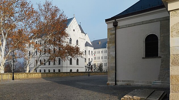 Kaptalándomb je místem velmi zbožným, vysoká škola s teologickým zaměřením sem tudíž zapadá celkem přirozeně. Zaregistroval jsem ji samozřejmě hned na začátku – cestou od mostu na vrch je po pravé straně, ale čas na fotku nadešel až teď krátce po poledni, kdy mířím od baziliky k Biskupskému hradu.