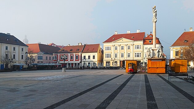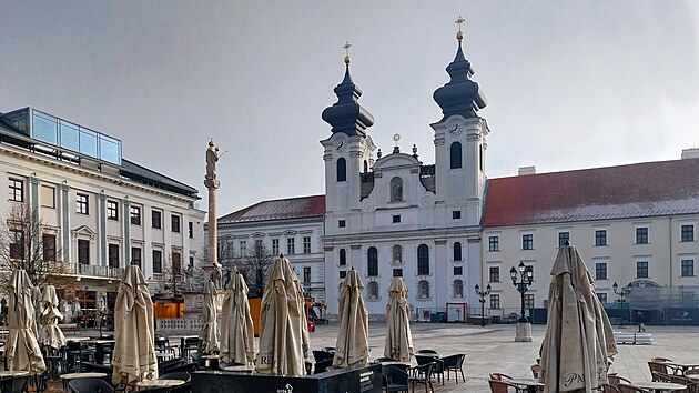 Vracím se ty dvě stovky metrů na Széchenyiho náměstí. Mariánský sloup (maďarsky Mária oszlop) trochu překrývají stánky zbylé tu patrně od adventu, řadu renesančních domů na severní straně náměstí naopak řada slunečníků neskrývá skoro vůbec. A když jsem před chvílí hovořil o těch souvislostech, mám tu jednu čerstvou. Právě v jednom z těch domů je ona restaurace, kde jsem před chvílí byl na obědě. Ale je čas konečně vejít do kostela.