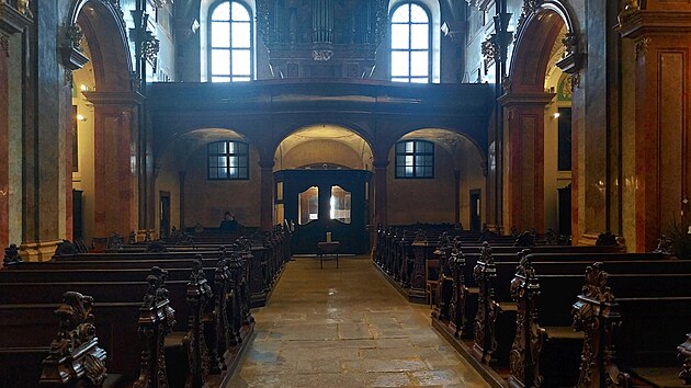 Současná podoba interiéru je asi o sto let mladší než samotná budova. Kostel prodělal ještě několik drobných úprav, ale časové údaje o nich se pouze odhadují, neboť písemné záznamy byly ztraceny. Ze stejného důvodu není známý tvůrce vyřezávaných lavic. Omlouvám se za ne moc povedený úhel pohledu, ale v kostele právě probíhají nějaké opravy. Po celé délce stropu je natažena plachta, kterou jsem prostě v záběru mít nechtěl. Z téhož důvodu jsou sotva vidět varhany, instalované v roce 1757.