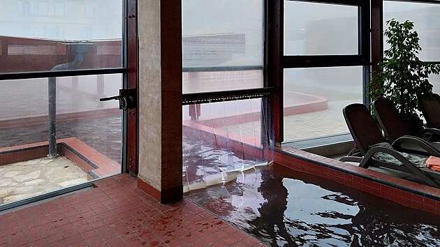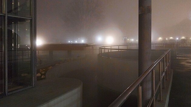 Mluvil jsem o té mlze nad lázněmi. Možná to z fotky tak nevyzní, ale v té venkovní části bazénu by se jeden málem ztratil.