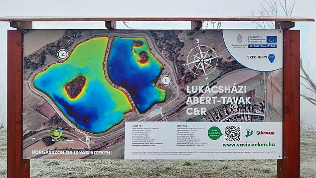 Nakonec mám sadu lehce i těžce zamlžených fotek, mnohem početnější, než tady prezentuji. První jezero mám v tuhle chvíli takřka za sebou a blížím se k parkovišti. Mají tu informační tabuli s další variantou názvu. Tentokrát je celé vodní dílo popsáno jako Abért tavak, tedy Abértova jezera. Doteď jsem netušil, že v jezerech jsou také nějaké ostrůvky. Snad je vhodná chvíle říci si konečně něco o účelu zdejšího vodního díla.