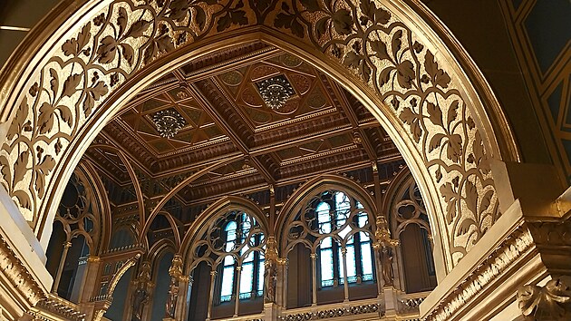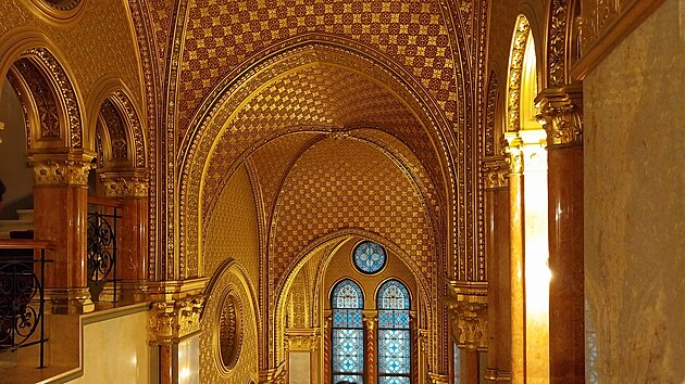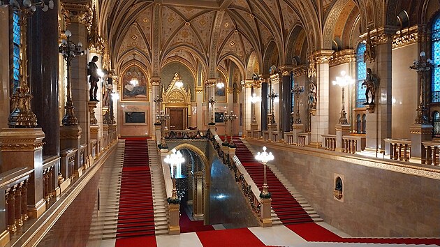 Prohlídka sídla maďarského parlamentu začíná na schodišti číslo 17, což je sice přesný technický popis, ale mnohem více řekne jeho neoficiální název Zlaté schodiště (maďarsky Arany Lépcső [araň lépčő]). Se zlatou výzdobou se vůbec potkáte na mnoha místech, a i když je naneseno ve velmi tenké vrstvě, v celé budově je ho asi 40 kilogramů.