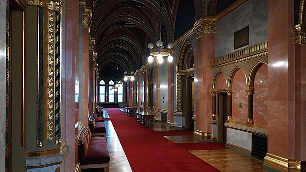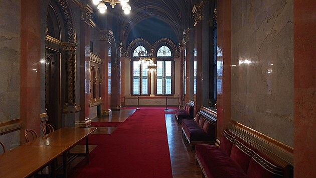 Sloupy a obložení stěn jsou z mramoru. Většinou z přírodního, místy byl použit mramor umělý. To zřejmě platí i pro dlouhou chodbu, kterou nás průvodkyně vede k hlavnímu schodišti. Ta také řídí to, co v tu kterou chvíli návštěvníci uslyší ve sluchátku audioprůvodce. Z něj se dozvíte spoustu věcí o budově, například to, že pohovky po stranách chodby jsou staré jako budova sama. Organizačních pokynů však dává audioprůvodce jen velmi málo. A právě s nimi občas do vysílání vstoupí naše průvodkyně, udílí je ovšem pouze maďarsky a anglicky.
