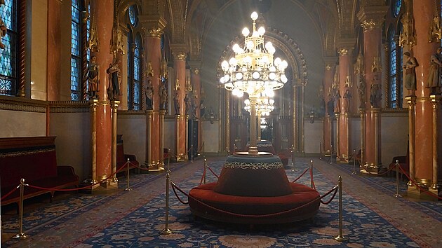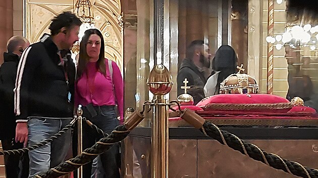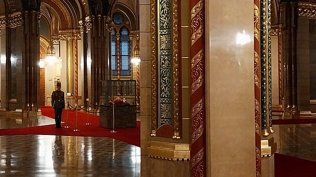 To samé zatím platí o svatoštěpánské koruně. U hlavního schodiště musíme nějakou dobu čekat. Skupina před námi se patrně někde zdržela, a tak ji teprve po chvíli ke korunovačním klenotům vpustí.