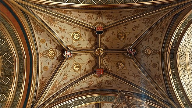 Trochu z dlouhé chvíle fotím část stropu s různými verzemi maďarského státního znaku. Ten velký po stranách, na fotce ležící na boku, nenápadně odráží dobu vzniku budovy. Spodní část štítu totiž neobsahuje znak Bosny, kterou Rakousko-Uhersko anektovalo až v roce 1908.