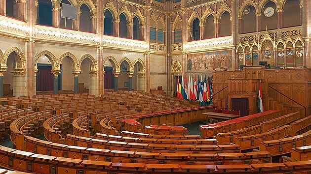 Další chodba nás přivede do zasedacího sálu. V zrcadlově souměrné budově parlamentu jsou sály dva, neboť parlament byl v době jejího vzniku dvoukomorový. Dnes tedy 199 poslanců v jednom sále zasedá, zatímco ten druhý, zcela totožný, ukazují turistům. Výjimečně jej používá i poslanecký sbor, například v případě, že v jeho sále probíhá nějaká větší údržba.