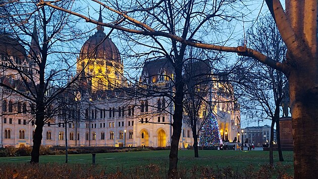 Čekám tu jen na setmění, chci zahlédnout parlament aspoň trochu nasvícený. Možná na fotce najdete i právě rozsvícený vánoční strom.