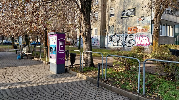 U jízdenkového automatu je vzácně volno. U přilehlé zastávky na autobus zrovna nikdo nečeká, a tak celé zákoutí vynikne. Zvláštní, je to jen několik málo desítek metrů hlavní a docela frekventované ulice, ale je tady špatně snad úplně všechno. Nevábná postava na lavičce, nevábně vyhlížející panelák se stejně nevábně počmáranou zdí a hodně zašlými poutači.