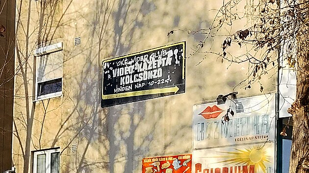 A tady si dovolím detailní pohled. Opotřebovaný nápis na té černé ceduli je pořád čitelný. Video kazetta kölcsönző, čili půjčovna videokazet. Každý den otevřeno od deseti do deseti. Uvážím-li, kdy systém VHS odešel do dějin, pak je tohle skoro zázračné přežití poutače němým dokladem o zpustlosti místa. A samozřejmě je tu otázka, jak mohou být aktuální ty zbylé reklamy.