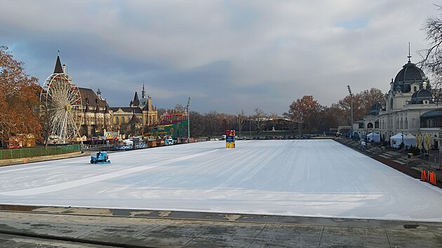 Veřejné bruslení, kvůli kterému v zimě jezdila podzemní dráha v kratších intervalech, probíhá i dnes. Děje se tak stále na stejném místě. Umělé kluziště v Městském parku (maďarsky Városligeti műjégypálya) bylo otevřeno už v roce 1870. A protože právě probíhá úprava ledové plochy, povede se mi kluziště vyfotit bez lidí.