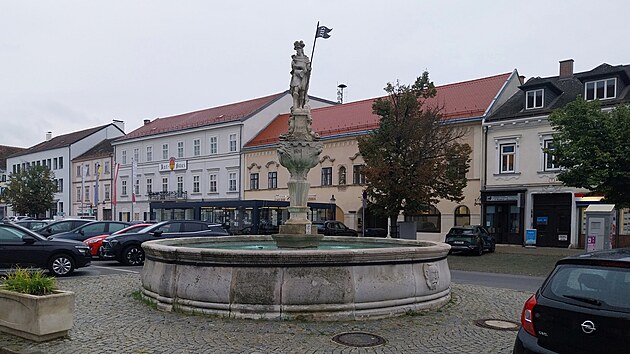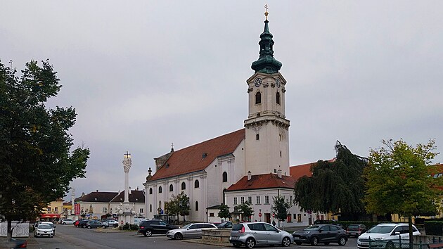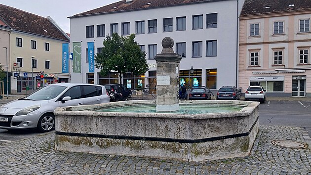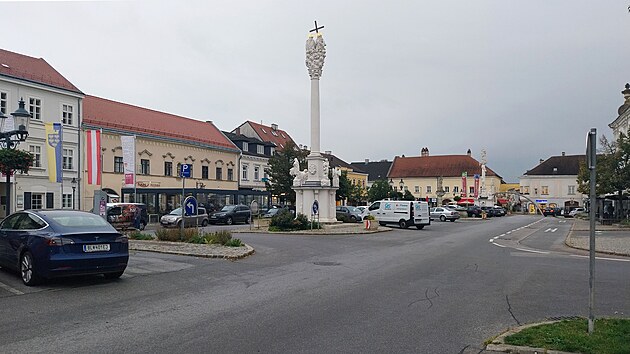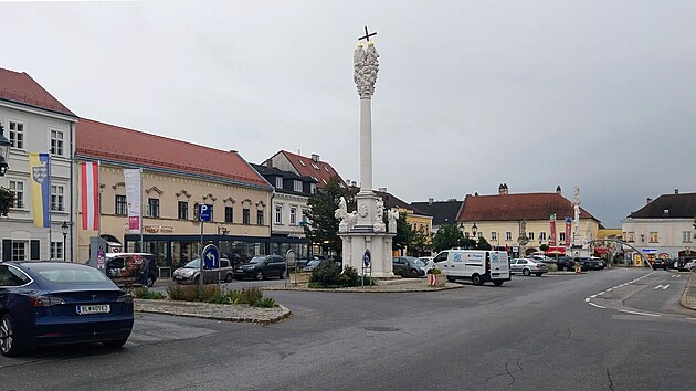 Parkuje se přímo v centru na Hlavním náměstí (německy Hauptplatz). Denní doba pokročila natolik, že to budu nakonec mít zdarma. Dominant je na náměstí více, samozřejmě je tu Farní kostel Nejsvětější trojice (německy Pfarrkirche zur Heiligen Dreifaltigkeit), postavený mezi lety 1696 a 1702 jako výraz vděčnosti po vítězství nad Turky a zažehnání morové epidemie. Zadání, podle nějž měla být zahrnuta strážní věž ze 13. století do nové stavby kostela, se může zdát neobvyklé, ale v těchto končinách se pár takových kostelů najde. Kontrast mezi původní věží a barokní přístavbou zůstal patrný, celá zvonice je pak vůči zbytku stavby o několik stupňů pootočena. To už je na první pohled patrné méně.
