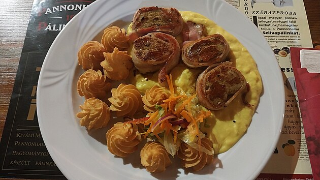 Záměr zkusit něco nového mi vyjde. Slaninou obalovaná panenka s bramborovou kaší vypadá dobře a stejně tak i chutná, zajímavým doplňkem jsou pak bramborové pusinky.