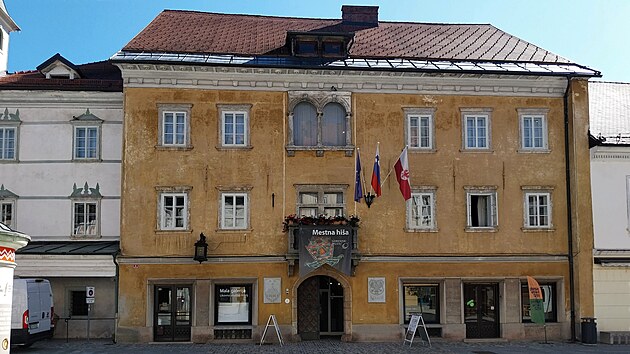 Náměstí je sice dlouhé, ale poměrně úzké. Ten správný pohled na důležité budovy se hledá ještě hůře, než tomu bylo v případě kostela na Pungartu. Fotku radnice (slovinsky mestna hiša) jsem nakonec pořídil na několikátý pokus ne opřen, ale přímo přitisknut na zeď protějšího domu. Když ještě připočtete čekání na co nejméně lidí v záběru, vyžádá si to nějaký čas strávený v docela pozoruhodné pozici. Vynechat radnici však nemohu. Její přední část pochází ze 16. století, byla přistavěna na starší menší dům, stojící od náměstí trochu stranou. Tím se radnice, považovaná za jednu z nejvýznamnějších renesančních budov nejen v Kranji, ale v celém Slovinsku, srovnala do řady s ostatími domy.