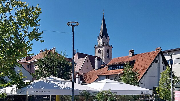 Za fotkou Kostela sv. Kanciána a jeho společníků mučedníků (slovinsky Cerkva svetega Kancijana in tovarišev) se naproti tomu trochu naběhám. Alespoň zvonice, vysoká 40 metrů, je vidět z mostu přes Sávu, zbytek kostela zakrývají okolní domy.