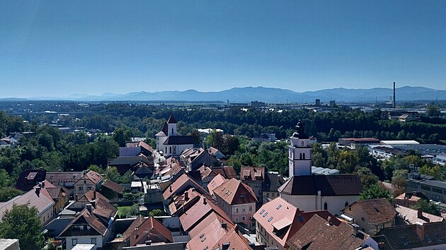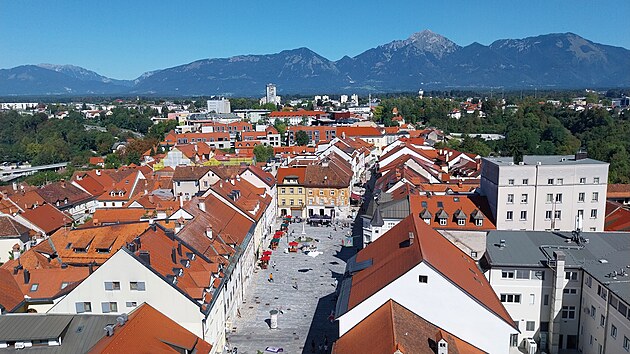 Pohled na horní část náměstí na pozadí karavanského horského hřbetu je sice úchvatný, ale nějak mi ta výška dnes nesedne. Snad k tomu přispívá i fakt, že vyhlídková plošina je velmi úzká. Na opření se o železné zábradlí nemám ani pomyšlení.