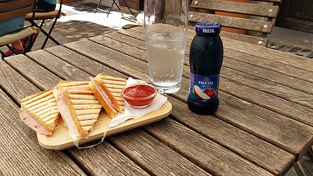 Před jednou hodinou po poledni se zastavím aspoň na něco malého. Čas by sice velel k řádnému obědu, ale v tom horku víc nedám.