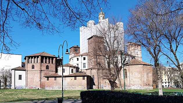 Raně křesťanskou baziliku dělí od řady sloupů méně, než by se mohlo na první pohled zdát, a nejde jen o prostou vzdálenost. Postavena byla totiž někdy ve 4. až 5. století, dokončena byla pravděpodobně roku 402, i ona tedy pamatuje starořímské časy, byť tedy možná jen velmi krátce. Každopádně si tu přes malé náměstí podávají symbolicky ruce římská pohanská éra a počátky křesťanství. Tohle spojení vám však neukážu. Celá strana kostela přilehlá k náměstí je totiž pod lešením a pod plachtami, mnohem lepší pohled je z parku.