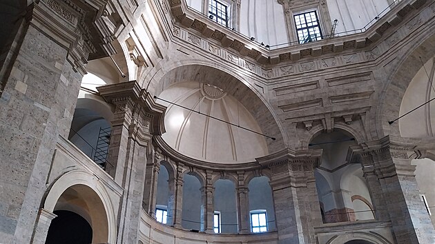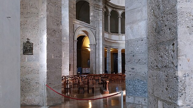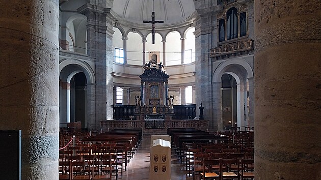 Kruhový půdorys nikdy nebyl pro křesťanské chrámy zrovna typický, a tady zůstal do jisté míry znatelný. Možná lépe zevnitř budovy, která má tak zcela osobitou atmosféru, a spolehlivě tak nahradí tu, která právě teď tak trochu chybí na náměstí mezi kostelem a sloupy.