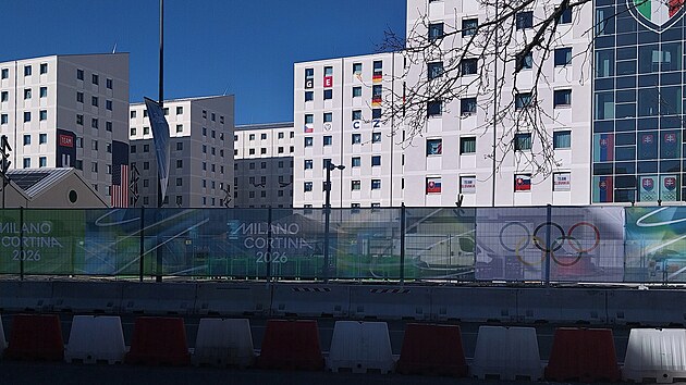 Vstupenka je nicméně zakoupena, zbývá tedy jediná možnost: až do chvíle, než se dostanu do haly, se musíme držet pohromadě. Ve dvě tedy společně vyrazíme z Českého domu. Nejprve projdeme kolem olympijské vesnice, kde může pozorné oko čtenářovo spatřit vlajkou i nápisem označená okna milánské části české výpravy.