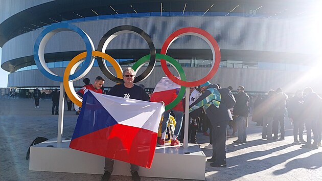 Po pětadvaceti minutách se opět dáme do pohybu, záhy všichni čtyři bez problémů projdeme kontrolou vstupenek. Stihneme se ještě vyfotit před olympijskými kruhy, pro tento účel mi pan Karel nejen půjčil „rodinnou“ vlajku, ale též stiskl spoušť. A pak už se naše cesty mohou rozejít.