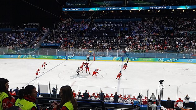 Samotný zápas začne přesně podle plánu, ale právě ty místní kolegyně stojí na tak nešikovném místě, že mi prakticky zakrývají levou polovinu hřiště. Řešení je naštěstí jednoduché: do haly pro 11.800 lidí přišlo asi 10.300 diváků, takže se najdou i volná místa. Stačí se přesunout o řadu výše a je po problému.