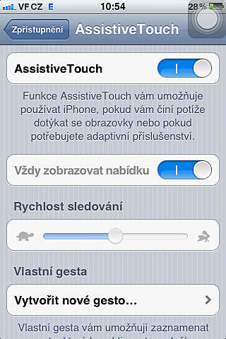 Jedná se o usnadnění pro lidi, kteří z nějakého důvodu nemohou ovládat svůj iPhone nebo iPad gesty či tlačítky, které mají tato zařízení k dispozici. Ovšem dá se využít, jako náhrada za ona tlačítka ve chvíli, kdy se některé z nich odebere na zasloužilý odpočinek. Tato funkce je do systému iOS přidávána od verze 5. A nejedná se o nic jiného než o virtuální tlačítko, které skrývá mnohá nastavení a usnadnění. Tuto funkci najdete v Nastavení->Obecné->Zpřístupnění->AssistiveTouch.