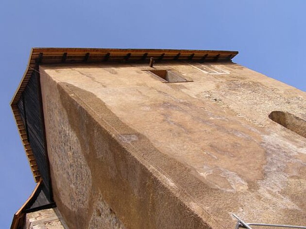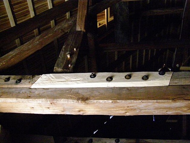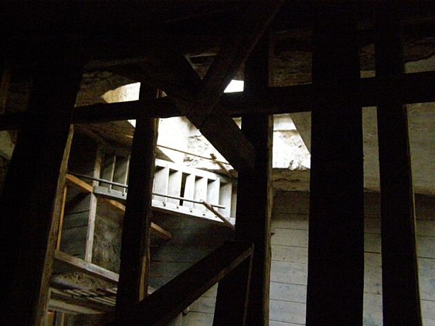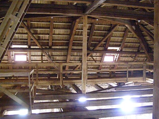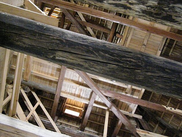 | Stačí zvednout hlavu a uchvátí nás průhled do krovu. Několik pater chybí a jsou místo nich pochozí lávky - výzva pro dobrodružné šplnání vzhůru . |