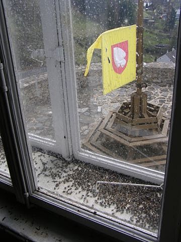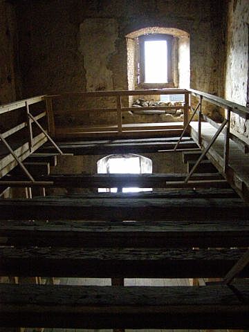 | Žebřík nalevo vede do nejvyššího místa hradu, úplně pod štít. To už jsem nedala, ale pár statečných ano. . |