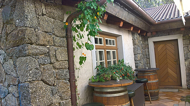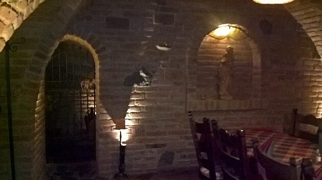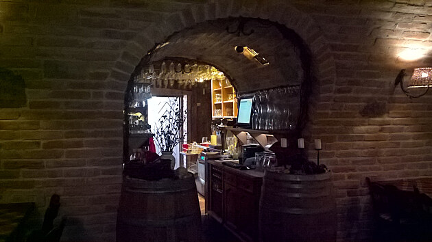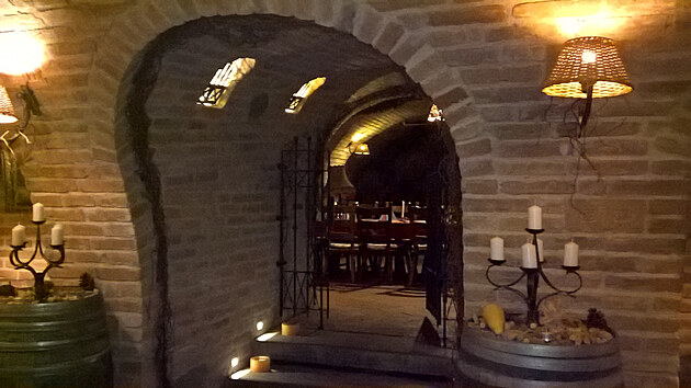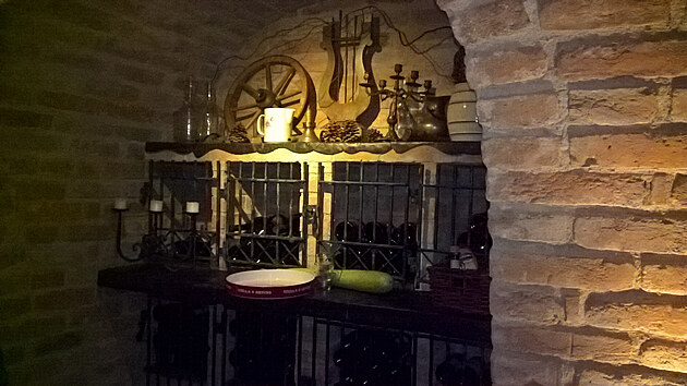 Velká prostorná, kámen zdi a svíčky, vinotéky a kované doplňky.