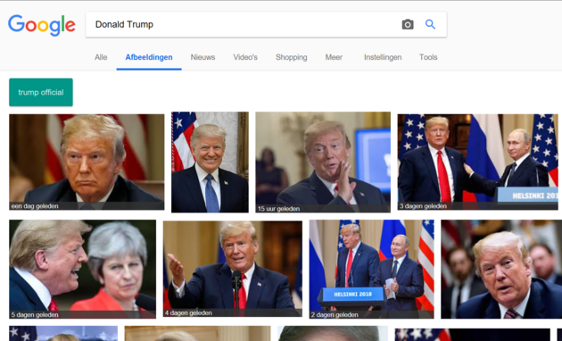 Nejjednodušší je pochopitelně položit Googlu dotaz "Donald Trump" a pak kliknout na "obrázky". Nevím, zda ve vyhledavačích v češtině se používá přesně slovo "obrázky", v nizozemštině je to slovo "afbeeldingen". Pak obdržíte obrovské množství fotografií Donalda Trumpa, začínající jeho oficiálními fotkami.