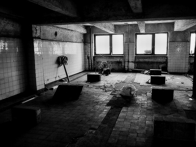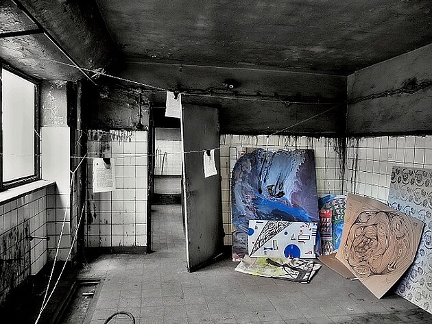 Pořídila jsem pár fotografií s těchto prostorů, které se budou časem renovovat. Vše zde bylo zaprášené a zchátralé. Polorozpadlé zdi s vytrhanými kachličkami a zrezivělé zbytky vybavení starých koupelen mi naháněly husí kůži. Všude byla hrozná tma a jen malými okny zde prosvítalo denní světlo.Nejvíce mne překvapily obrazy v místnostech, které nakreslila mladá malířka. Strávila pár dní v tomto neútulném prostředí a namalovala své pocity z těchto míst. Obrazy zde skvěle zapadaly a tvořily zvláštní kontrast. Autorka má u mne veliký obdiv a snad se mi podaří zjistit její jméno.