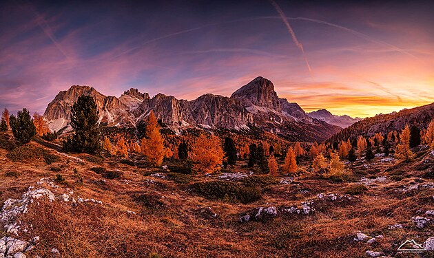 Po chvíli je už tak vysoko, že balíme svá fidlátka a přesouváme se k jedné z laviček, kde si dáváme pořádnou snídani a sušíme v prudkém Slunci naše spacáky navlhlé od ranní rosy. Slunce nádherně hřeje a vůbec to nevypadá na konec října. Užíváme si to,protože podle předpovědi, je to jeden z posledních krásných dnů letošního podzimu. Po snídani balíme věci, čeká nás dlouhý přesun až na Passo Giau, kde na nás čeká auto. Postupně ukrajujeme vzdálenost až po 3,5hodinách stojíme u auta a shazujeme těžké batohy ze zad. Odměňujeme se pořádným obědem a relaxujeme. Čeká nás poslední focení a pak už přesun směr Německo. Večerní focení bylo pěkné, jen chyběly výraznější mraky, který by měly šanci se obarvit.