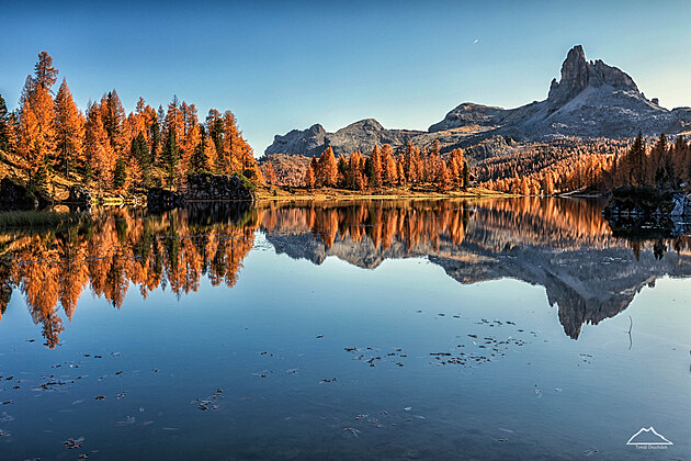 Ráno nás zastihlo připravené na krátký výšlap k jezeru Lago di Limides. Po 45minutách chůze opět nacházíme mokřad s bahnem a žádnou hladinou. Tak snad další rok. Přesto máme z focení radost. Svítání nádherně zbarvilo nebe a zlatavé jehličí na modřínech tomu dodává nadpozemskou krásu.