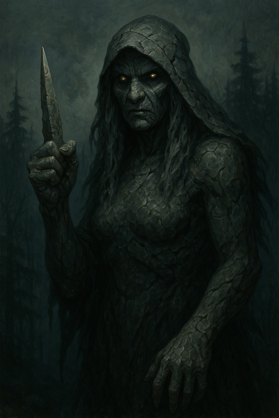 Byla to strašlivá ženská bytost, napůl duch a napůl kámen, jejíž pravý ukazovák tvořila dlouhá, ostrá kamenná dýka. Říkávalo se, že žila v nejvyšších hřebenech Velkých kouřových hor, tam, kde se mlha drží i v poledne a ticho se dá skoro nahmatat.