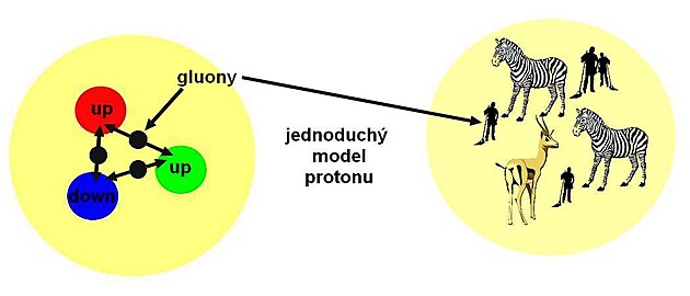 Proton patří mezi hadrony, částice, složené z jiných částic. Tvoří se z kombinace tří kvarků (jistě si vzpomenete na naše pomyslné částicové Zoo a jeho červený výběh, ve kterém žijí tři kvarkové rodiny). Nejsou to libovolné tři kvarky – ve viditelné hmotě vesmíru nacházíme jen ty nejlehčí ze všech – kvarky „up“ a „down“.