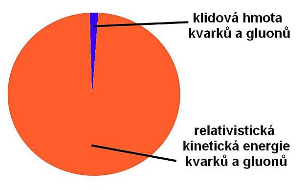 Hmotnost protonu – 938 MeV. Hmotnost kvarků a gluonů v protonu – 16 MeV. Skutečná klidová hmota elementárních částic, ze kterých se proton skládá, tvoří tedy jen asi setinu jeho reálné hmoty.