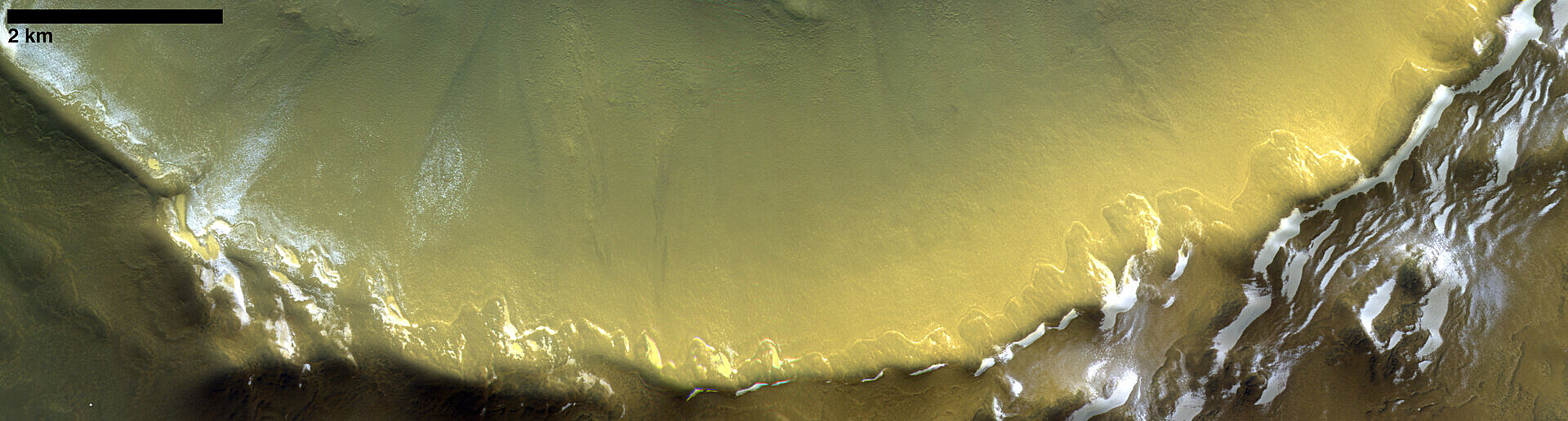 V polárních oblastech se nacházejí nejen duny ale také krátery. V nich se dá led najít po celý rok. Na obrázku je vidět jihovýchodní stěna kráteru s průměrem 35 km. Led tu neroztává ani v létě - od Slunce totiž nedostává dostatek energie.