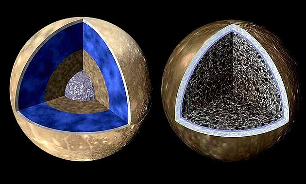 Díky práci sondy Galileo dnes víme, že je vnitřní struktura měsíce relativně složitá. V centru se nachází kovové jádro. Kolem něj se rozprostírá kamenný plášť. Ten je krytý několika druhy ledu, které tvoří diferencované slupky (viz obrázek vpravo). Není vyloučena ani existence tekuté vody.