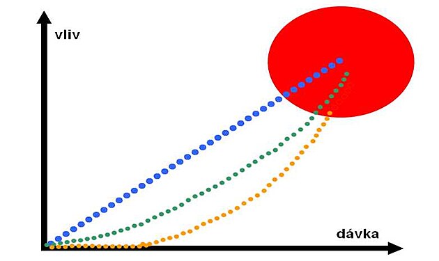 Vztah se může vyjádřit buď lineárně (na obrázku modře), nebo nelineárně (zde znázorněno zelenou barvou) případně nelineárně s určitou základní naprosto bezpečnou hodnotou záření, která žádné pozdní změny nevyvolává (v obrázku znázorněno oranžovou barvou).