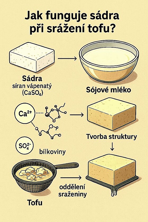 Sójové mléko je emulze vody, bílkovin, tuků a sacharidů. Při jeho srážení dochází k denaturaci bílkovin. Tím se mění jejich prostorová struktura - a to vede k vytváření pevné sítě. Sádra (chemicky síran vápenatý, CaSO4·2H2O) tento proces spouští díky vápenatým iontům (Ca2+).