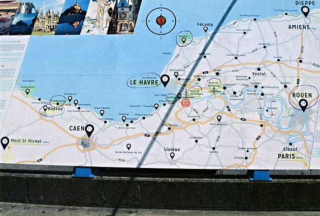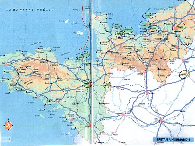 Mapka obou francouzských celků s vyznačenými navštívenými místy pochází z turistického průvodce „Bretaň a Normandie“ nakladatelství Rough Guides. (Všechny další obrázky jsou vlastní fotografie.)