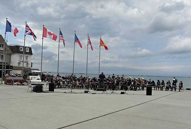 V centru městečka Aromanches byly 9. června 2025, kdy jsme sem dorazili, oslavy stále ještě v plném proudu. Za americkým orchestrem hrajícím dobové skladby, byly v moři tu a tam vidět zbytky mohutného umělého přístavu z betonových dílů, dopravených sem z Británie tajně přes La Manche.